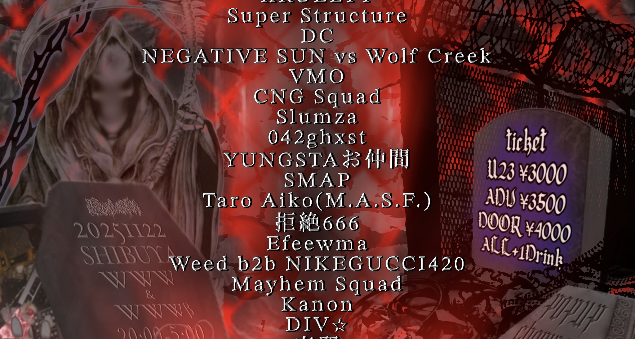 ラッパー勢にはrirugiliyangugiliと愉快な仲間達を中心に構成されるコレクティブ、CNG Squad。国内Phonkシーンの最前線を走るSlumzaと042ghxst。青森三沢出身で独特なリリックとバイブスで話題のYUNGSTA お仲間。あの国民的人気アイドルグループとは全く無関係のスカムヒップホップユニットSMAP。
