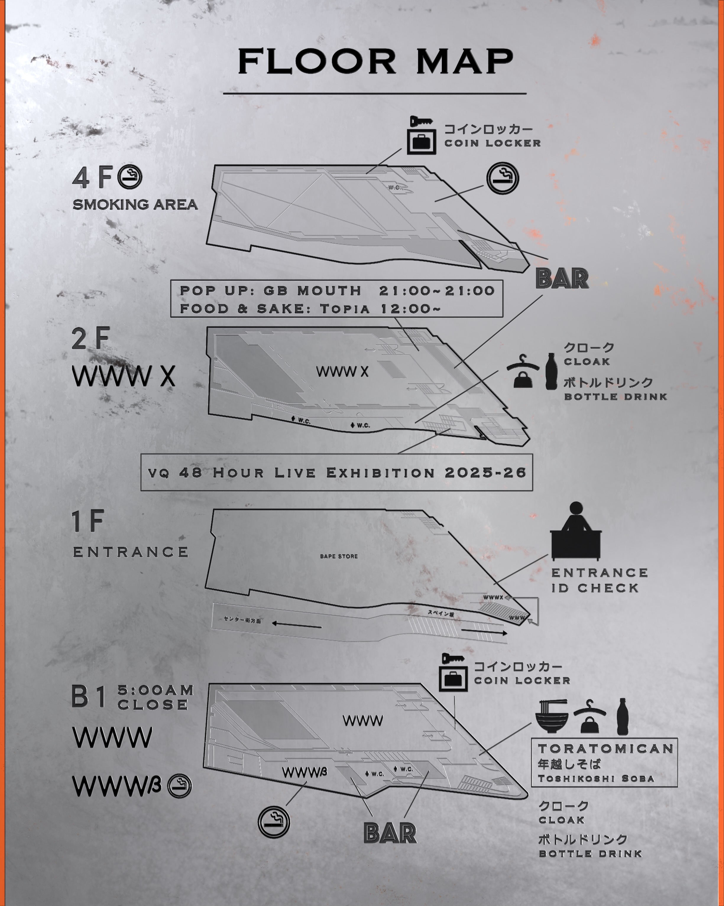 時空を超えた新・伝統へ!世界を巡るみんなのきもちと15周年を迎えたWWWが送る、24時間を駆け抜ける全館解放ニューイヤー・パーティのマップ公開。奇しくも長尺イベントとして共鳴する同日Forestlimitで開催のvqの48時間単独ライブ生中継をyoh murataがWWW X階段踊り場にて展示として、ポップアップにみんなのきもちとコラボレーション・グッズを発売したGB MOUTH、恒例のフードとなる年越しそばにTORATOMICAN、お昼からの豚汁と熱燗でTopiaがラインナップ