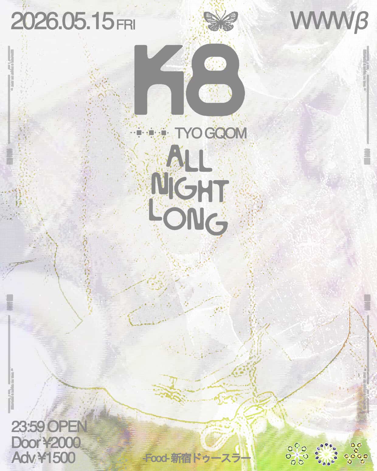 南アフリカ発ジャンルGQOMをメインとしたコレクティブ『TYO GQOM』のメンバーとしても活動するDJ/プロデューサーK8がキャリア初となるALL NIGHT LONG Setが渋谷WWWβにて敢行される。パーカッシブなサウンドを軸に、UKベースミュージックへの知識の基、独自の感覚で多様なジャンルを接続/昇華し続けている。
