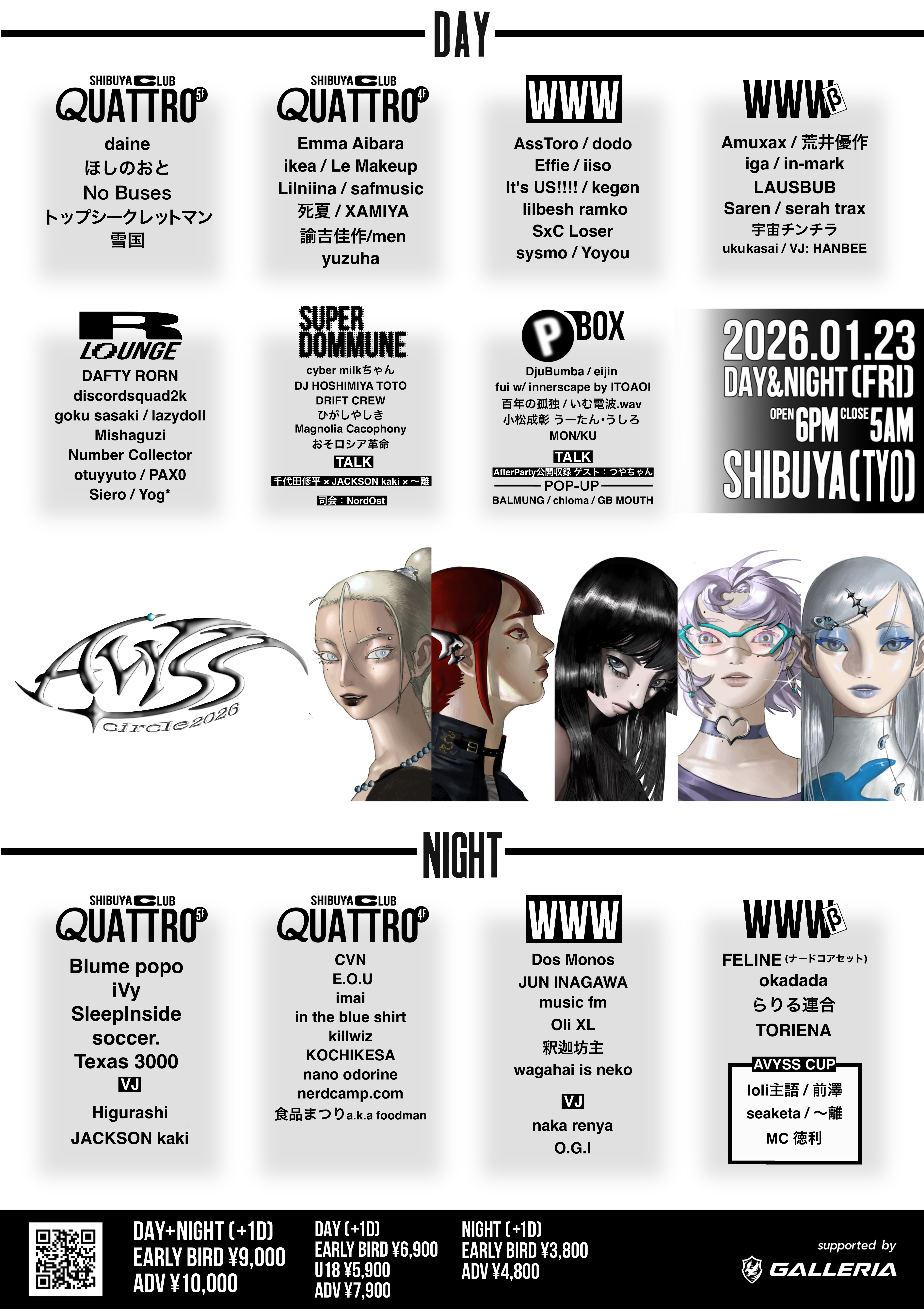 20年代以降のジャンルやカテゴリーを超越する感覚を、AVYSSの視点で包括するサーキット・イベント「AVYSS Circle 2026」が、2026年1月23日に渋谷5会場・7フロアを利用して過去最大規模で開催。今回の発表では最終ラインナップ、タイムテーブル、当日CLUB QUATTRO 4Fで販売するAVYSS Circle 2026オフィシャルTシャツが公開。各フロアのムードを反映したキャラクターのビジュアルは、中国出身のイラストレーターで過去にはYOASOBIのジャケットも手がけた清已/QINGYIが制作し、レイアウトはnaka renyaが担当している。チケットが販売中。 チケットURL : https://eplus.jp/avysscircle-2026/ 今回の発表で、CLUB QUATTRO 5FのNIGHTにBlume popo、R LoungeにDAFTY RORNが追加。また諸事情によりR Loungeに出演予定だったAOTOがキャンセル。DAYのWWWβで出演のuku kasaiは音源/映像出演に切り替わり、uku kasaiのVJにHANBEEが追加された。またキービジュアルを制作した清已/QINGYIデザインによるAVYSS Circle 2026のTシャツがCLUB QUATTRO 4Fで販売予定。